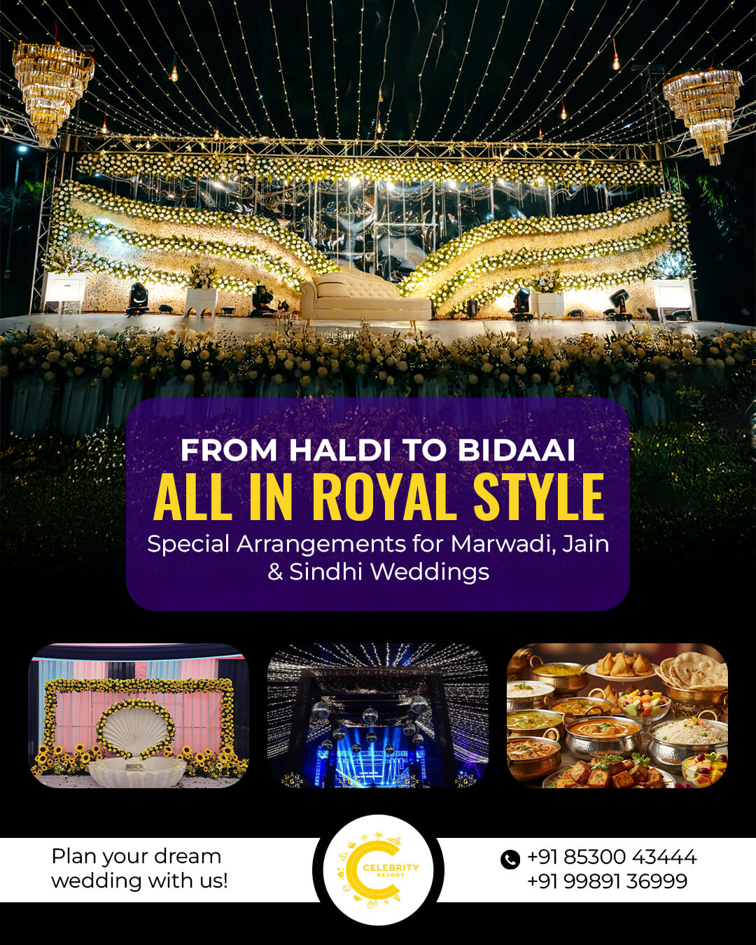 Host your dream wedding at Celebrity Resort, offering 7 elegant banquet halls and 6 expansive open lawns, perfect for every kind of celebration. Whether it’s an intimate gathering or a grand affair, our versatile venues and expert event planning will ensure your special day is truly unforgettable.